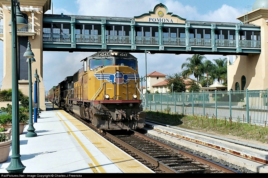 Eastbound stacks on the LA Sub pass under the Pomona footbridge, which spans both the LA Sub and the Alhambra Sub. On the right is the Southern Pacific station. The footbridge, which has become iconic in the decade or so since it was built for Metrolink, is intended to provide Metrolink commuters access to the the Pomona TransCenter, a bus station that utilizes the SP depot. SD70M #4243 was delivered to the UP from EMD on October 19, 2000, as part of an order of 285 units.