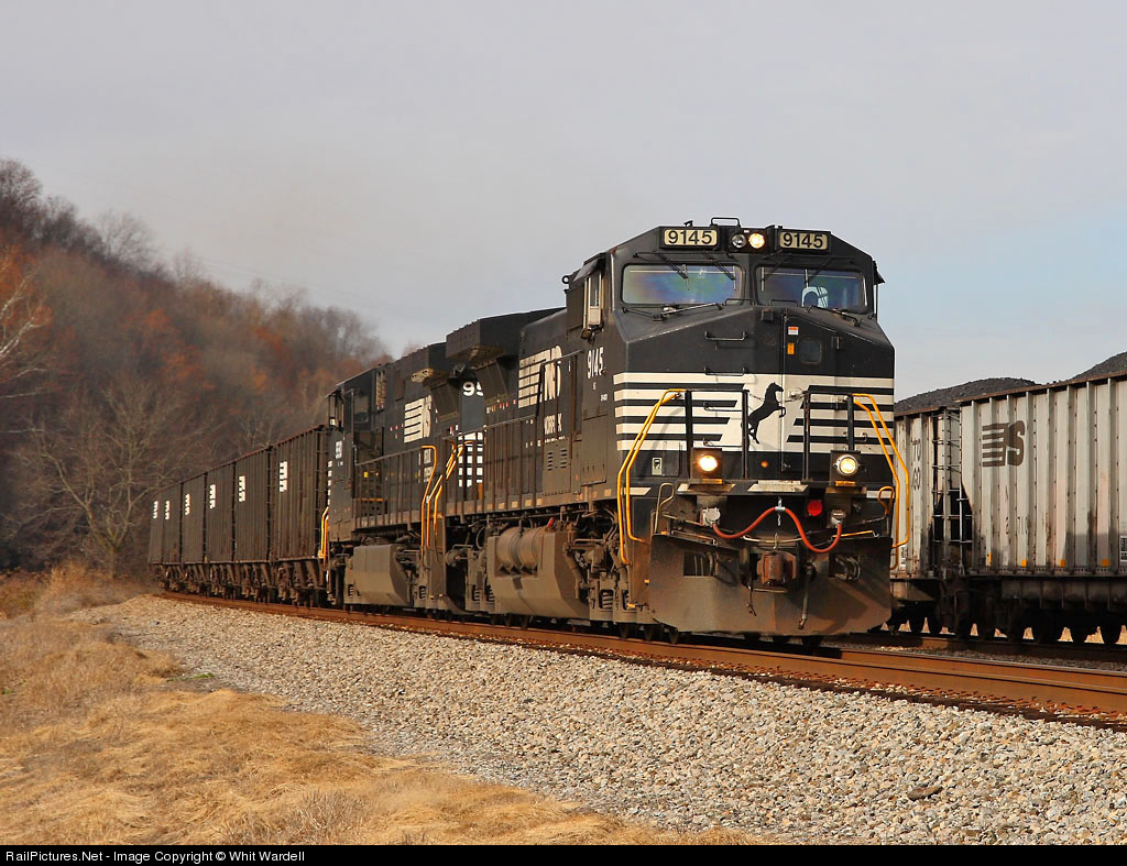 Loads west, empties east as NS 9145 leads empty train 857 by loaded coal train 850 on a gloomy late November day.