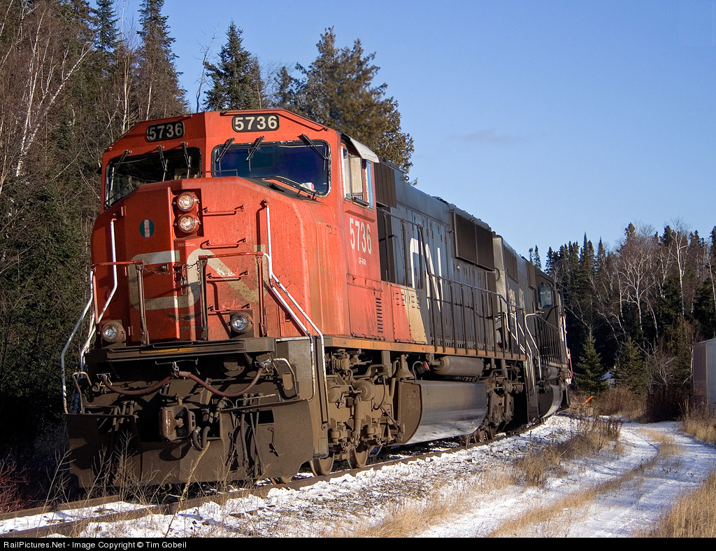 | CN 5736 crackles over weeds and takes a banked curve hauling a train into Pass Lake for the last time. This was the last train to ever pass through the small town, as it was in charge of dismantling the line. Shortly after this shot was taken the rails were removed, and all that was left of this scenic strech of track was the roadbed. |