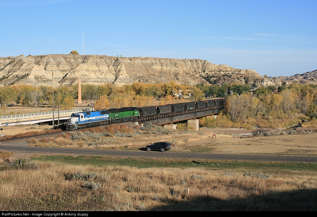 | A pair of SD60s suffice for moving these coal empties back to Glendive Yard, seen passing the entrance to the North Dakota Badlands National Park. |