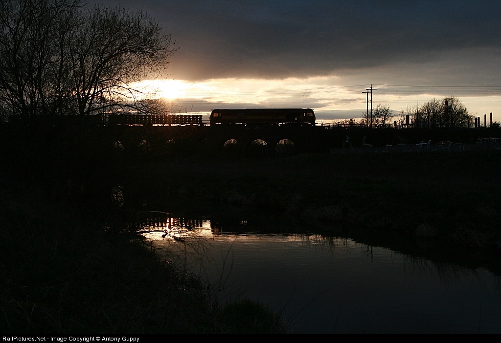 The sun comes out from a gap in the storm clouds as 60 048 'Eastern' crosses the River Nene on a Forders Sidings - Bescot engineers train conveying redundant track panels.