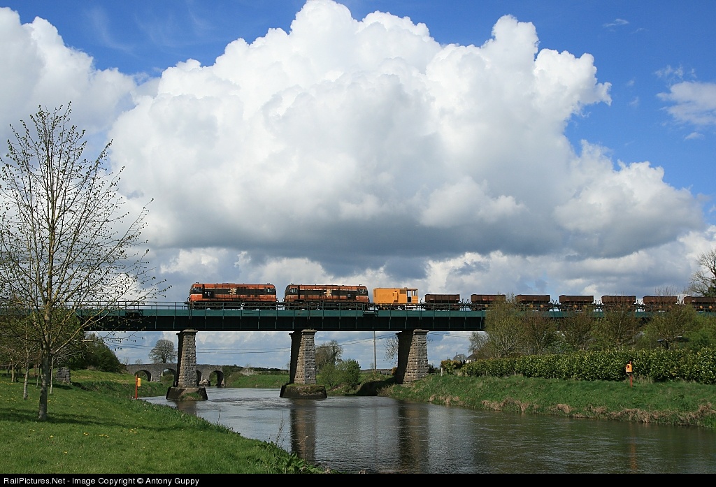 | Under towering stratocumulus cloud small GM's 146 and 190 take a ballast train for Portarlington over the River Barrow. Dating from 1962 and 1966 respectively, these locos are on borrowed time with only a handful of survivors. |
