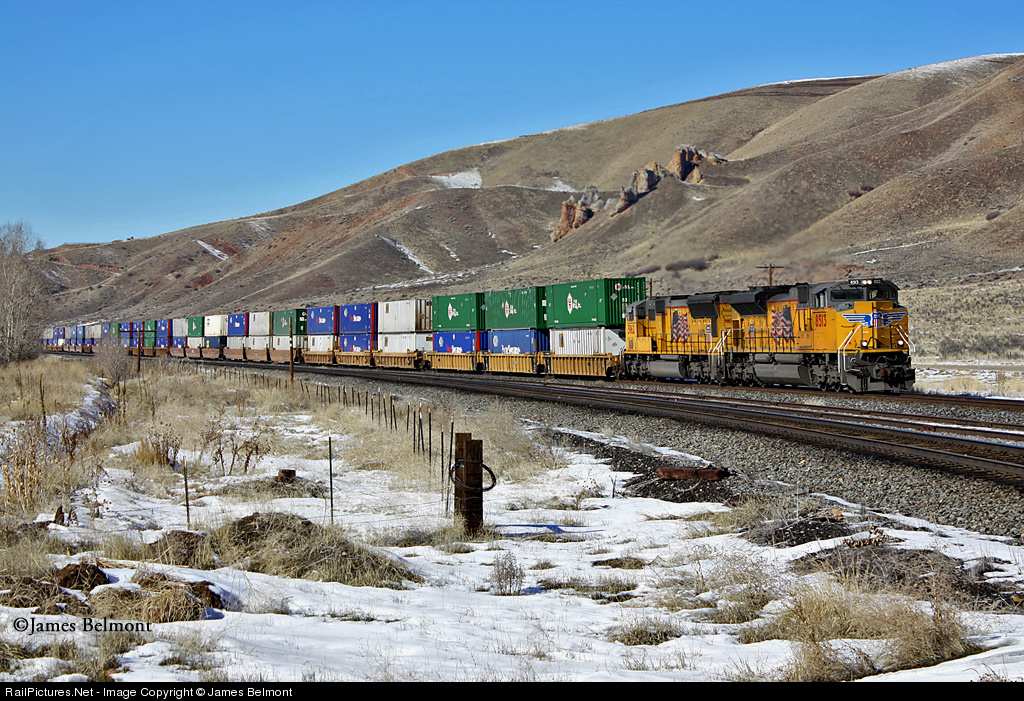 | With a nice mix of staked containers in tow, Union Pacific's Lathrop, CA to Global One 'K' train heads east through the rural community of Echo, Utah. |