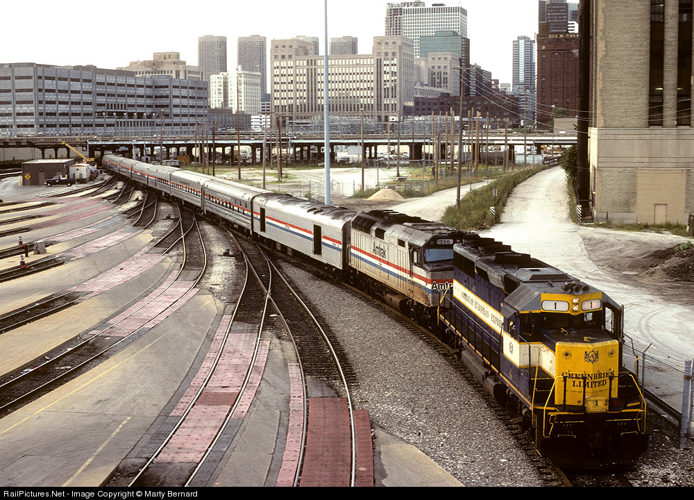 | The lead unit is lettered for American European Express predicessor to American Orient Express. The second unit is Amtrak F40PH #356 and the train is The Cardinal at 12th Street backing into Chicago Union Station. |