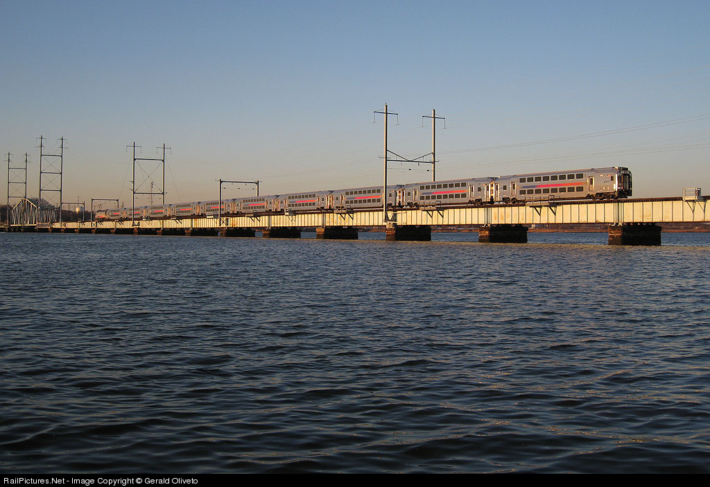 A ten car train of multi-level coaches glistens in the sunlight as it crosses the Raritan River at Perth Amboy.