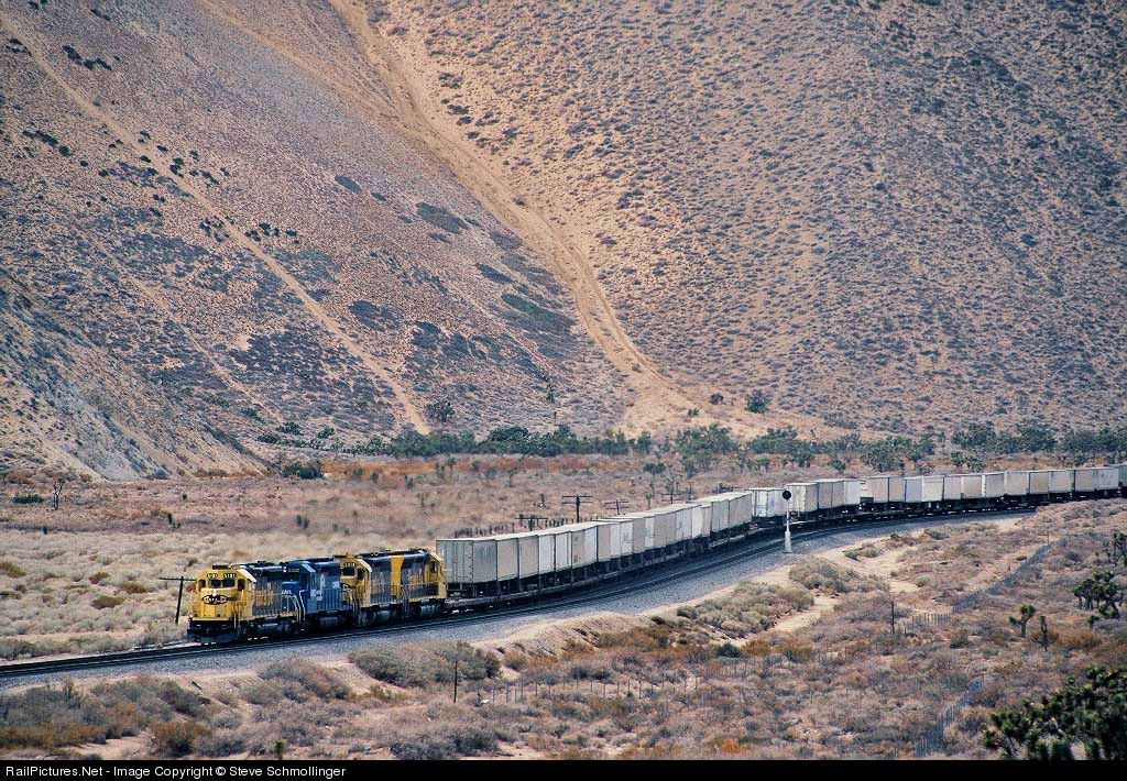 A Santa Fe pig train drops down through the old station of La Rose in the defile that allowed the SP to build the line from Tehachapi to Mojave.