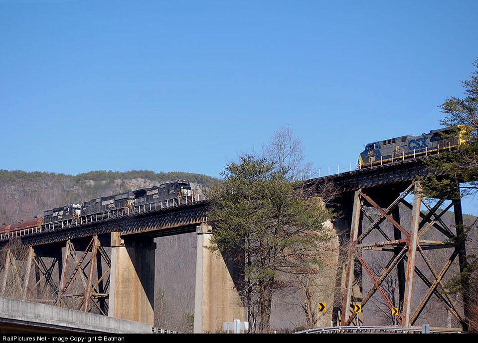 NS & CSX trains meet on Running Water Trestle just west of Chattanooga.