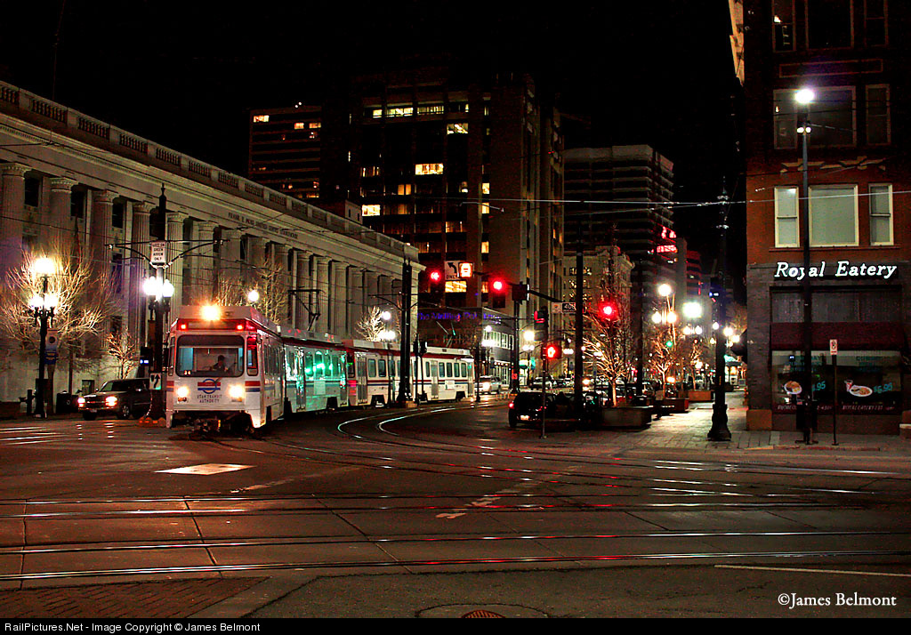 Arguably the most interesting location along UTA's TRAX system in the Salt Lake Valley is the University Line junction at 4th South and Main Street. In this view, University train 34, lead by two Bombardier/UTDC cars acquired second hand from the Santa Clara Valley Transportation Authority curve eastward onto the U Line. This location is technically half a 'grand union' where two tracks join two tracks with switches for movement in all directions offering maximum flexibility of operation. The large gray structure at left is the Frank E. Moss Federal Courthouse, and at right a street level cafe in the historic New Grand Hotel.