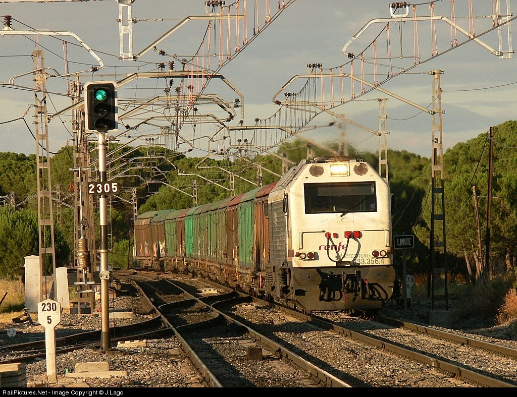 Freight train from Venta de BaƱos to Portugal with a rebuilt diesel 333.3 class in Vossloh Valencia.