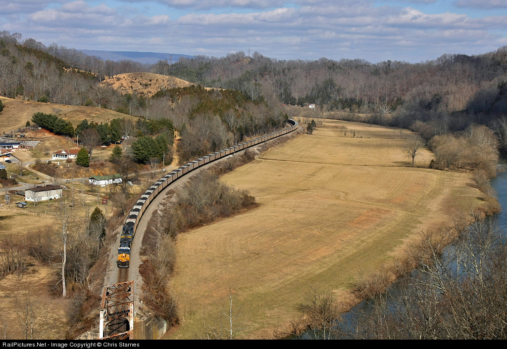 CSX loaded coal train N015 rolling southbound through the community of Starnes, VA and about to cross the Clinch River.