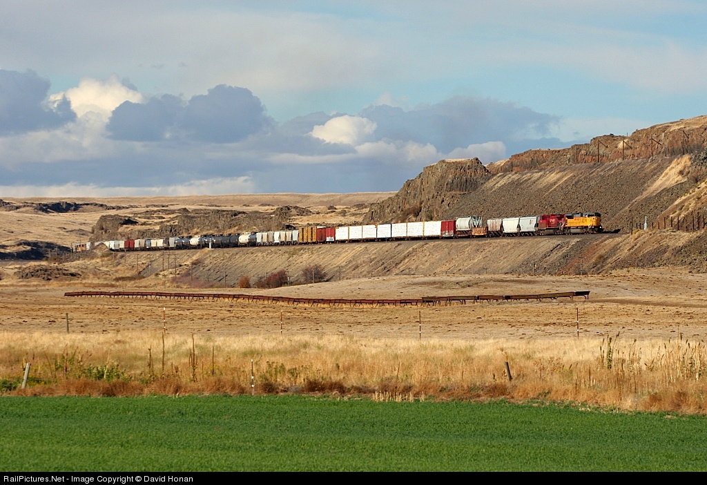 | A verdant patch of cultivated crops conspicuously contrasts with the natural brown color of the the eastern Washington "desert." Lying between the irrigated Columbia Basin Project lands and the famously-fertile Palouse region, this barren, arid scabland was where I found a short southbound manifest approaching Tunnel #17 on UP's Ayer Sub on an autumn afternoon as storm clouds ominously loomed in the distance. Cut into the basalt near the top of the butte is the abandoned SP&S 3rd Subdivision, a depressing reminder of one of the best-engineered rail lines I've explored. |
