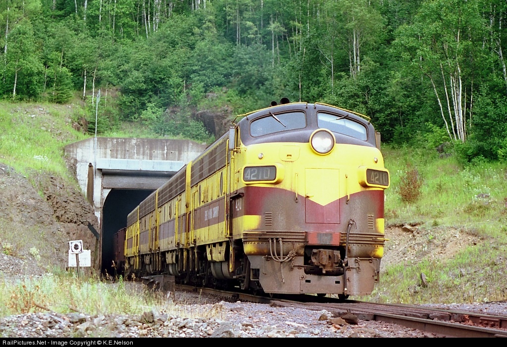 An LTV F-9A glides through Kramer tunnel on there way back to Hoyt Lakes, MN after dumping a train load of Iron Ore at Taconite Harbor, MN just moments befor this phot was taken.