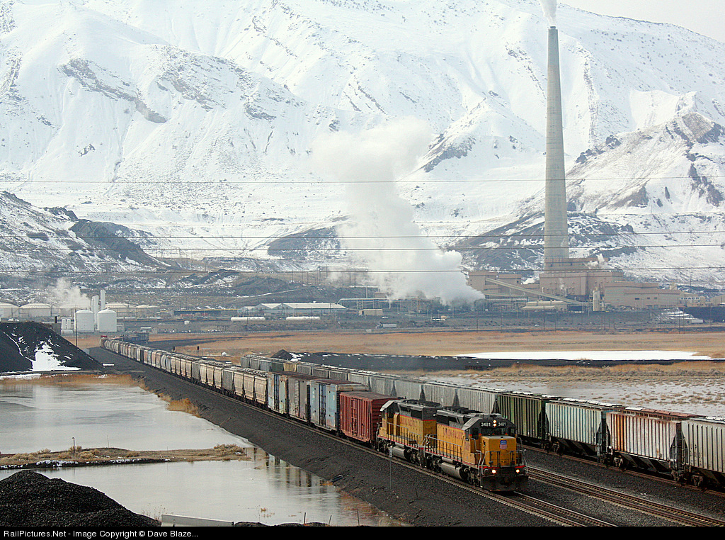 | A classic "snoot" leads the eastbound LUE50 back from Wendover to Roper Yard as it approaches the west end of Garfield Yard at MP768.2 on UP's Lynndyl Sub. The Massive Kennecott Copper Co. Smelter and refining complex dominate the scene in the background at the base of the Oquirrh Mountains where they meet the south shore of the Great Salt Lake. The 1215 ft high smokestack is the 4th tallest on the planet. |