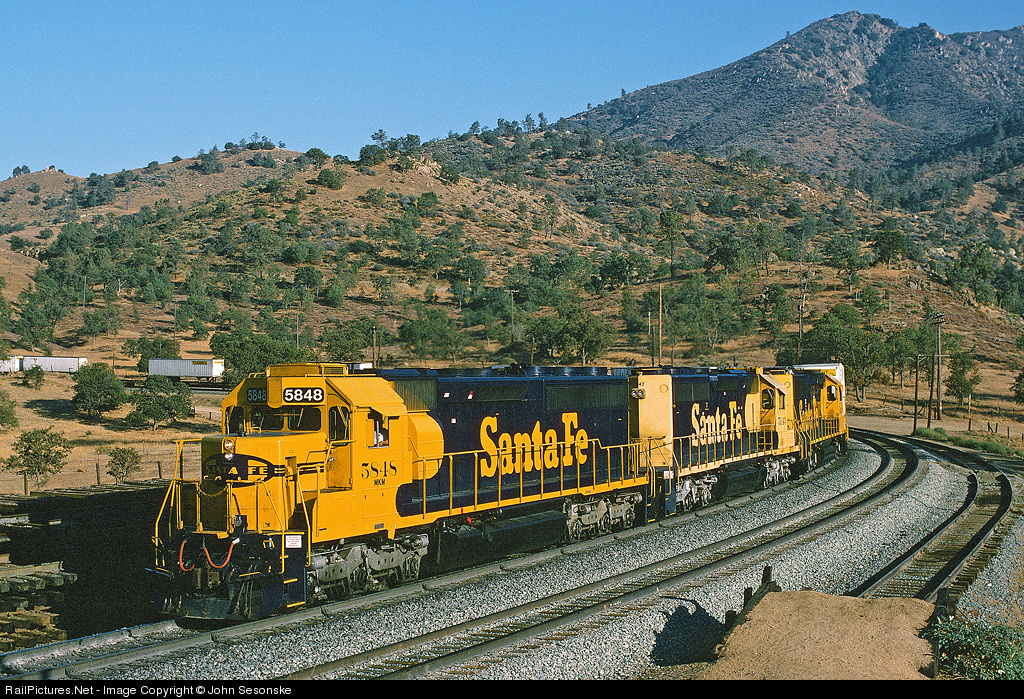 A WB ATSF intermodal descends around the top end of Tehachapi Loop lead by an SD45-2u that was delivered as #5642 and rblt 12-1986. The MKM initials on the lead unit mean it has been assigned to Morrison-Knudsen for maintenance on 4-1994. Trailing units are ATSF SD40-2 #5143 and an ATSF GP60.