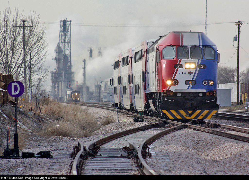 | A northbound Front Runner races north past the hand throw crossovers at Pioneer that allow the nightly YSC51 local out of North Yard to crossover from the UP to access some industries located off of "Pioneer Pass" which is a long freight passing track located on the east side of the UTA main track. In the background note the UP manifest pulling through the interlocking at CPC788 amidst in the shadow of the Flying J refinery complex. |