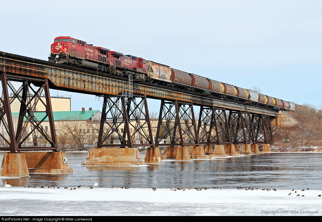 Soaring high over the Trent River and the town of Trenton, Ontario, CP 9593 and 9561 race west with 301's train, all grain empties. The gaggle of geese, ducks and swans are a fixture along the river here, and seem quite accoustomed to the passage of trains, barely noticing this train. 1223hrs.
