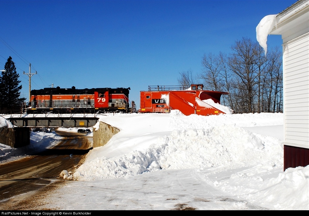 Passing through downtown Oakfield, MMA Plow Extra 79 and VB-150 plow move minimal snow on the already plowed mainline of the MMA. This extra is heading for the Houlton Branch - where drifts and snow have remained piled up.