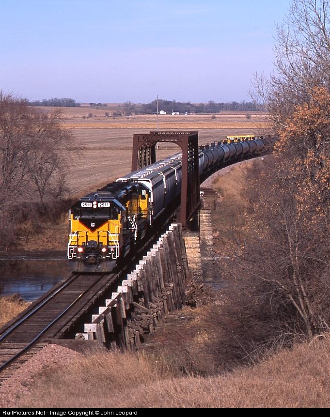 Dakota & Iowa's ethanol local crosses the Big Sioux River just north of Hawarden on its return trip to Sioux City.