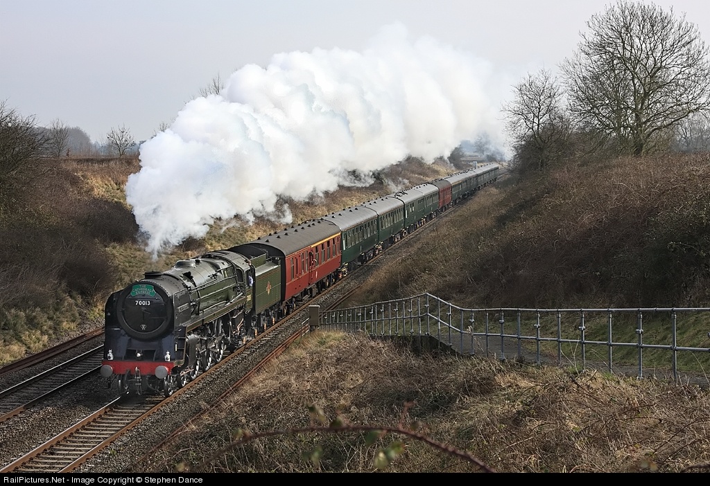| Britannia Class 7 Pacific 70013 Oliver Cromwell passes Baulking as it accelerates away from its water stop at Challow. The site of the junction for the long defunct Faringdon branch is just west of this location. The train was a St Davids Day special from Paddington to Newport |