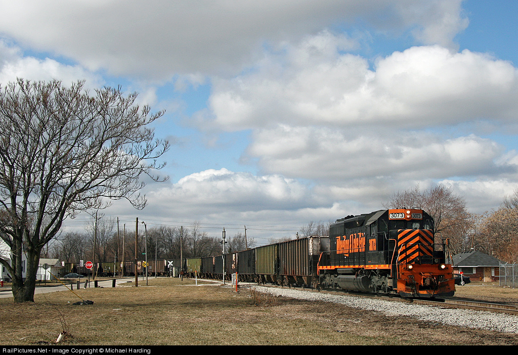Wheeling train KL82 (on NS) is leaving CN Lang yard and heading for the Maumee river through North Toledo in this view. Today's train features WE 3073 leading and WE 3034 on the rear with 29 loads, 74 empties, 5,800 ft & 6,000 tons. The long cut of empty hoppers on the front are returning from taking Coke to Detroit via W&LE & CN - a service that was recently handed off to CSX at Willard but is now going via CN (which also gives Wheeling a longer haul).