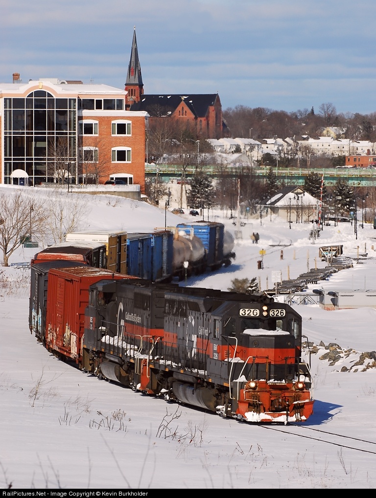 | A day after yet another snowstorm blanketed Northern and Eastern Maine, Bucksport to Northern Maine Jct. train BK-1 on the Pan Am Railway snakes through the former Bangor Yard site in downtown Bangor, ME behind GP40 326 and GP40-2LW 315. |