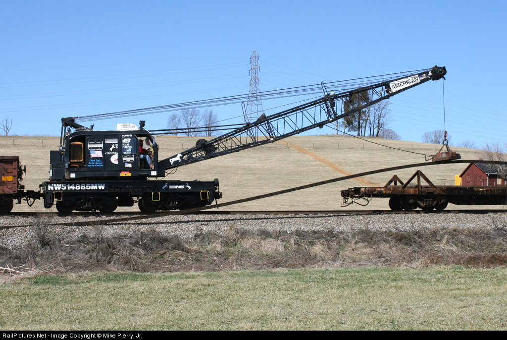 The work train's crane pulls a length of new rail off a flat using an electro magnet.
