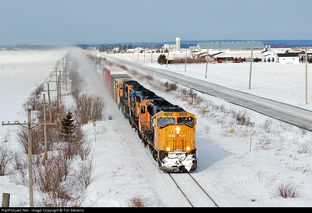 | 214's train is about to pass through the small town of Earlton with 108 cars. Muscling the train south are ONT SD75I 2102, SD40-2s 1735 and 1733 with SD75I 2101 bringing up the 4th spot. |