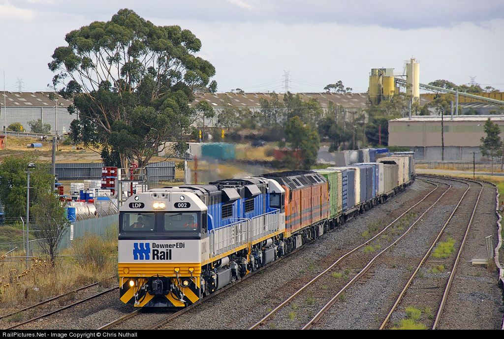 | On their second trial run to Melbourne, brand new hired "Locomotive Demand Power" Downer EDI/EMD-built LDP002 and LDP001 lead dead attached CLP10 and CLP12 on the 7MB7 QRN service from Melbourne to Brisbane on the approach to McIntyre loop. |