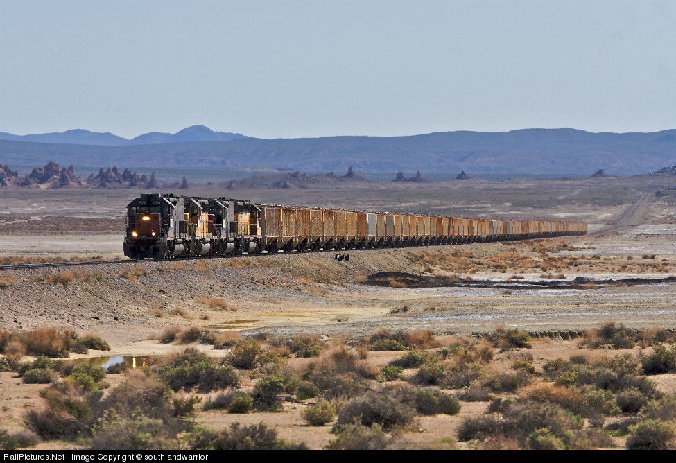 | Classic 2nd generation EMD power from SP and UP seems right at home as the engines lug a train of potash empties across the floor of the Searles Valley near the Pinnacles natural landmark. |