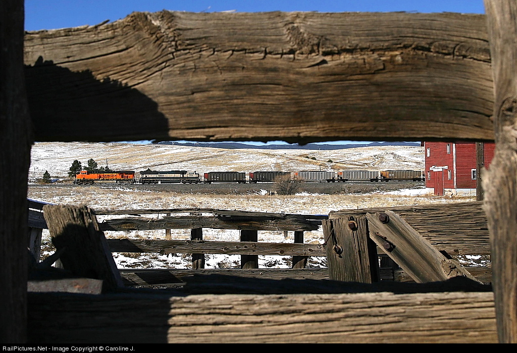 Through a small space in an old wooden structure, BNSF 5974 can be seen moving SB along the Joint Line.