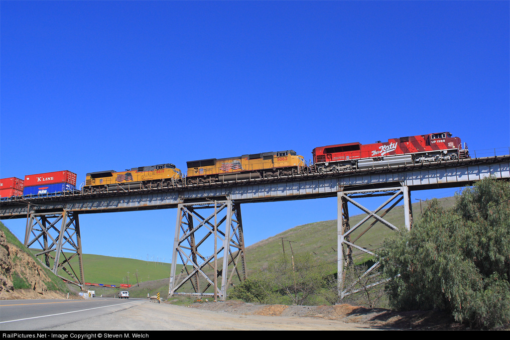 UP 1988 looks beautiful on the monster trestle crossing Altamont Pass Road with lush green hills in the distance.