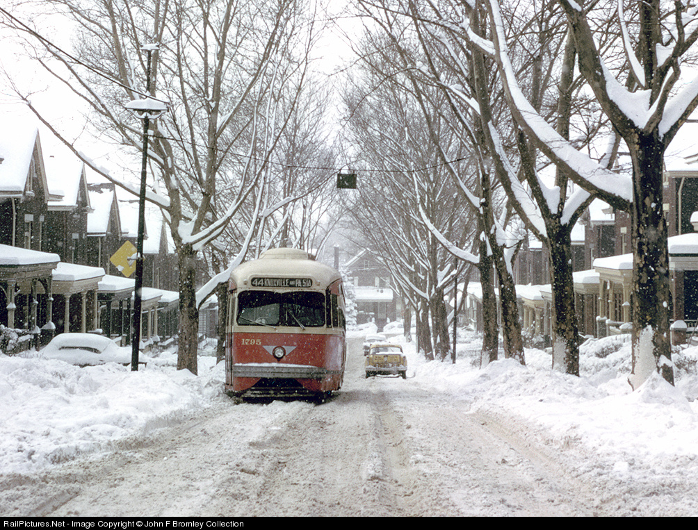 Snow in Pittsburgh is not as frequent as cities such as Buffalo or Cleveland but they do get their share each winter. Here one of photographer Joe Jessel’s charters poses as a Route 44 KNOXVILLE car on the very narrow Charles St east of Beltzhoover Av.