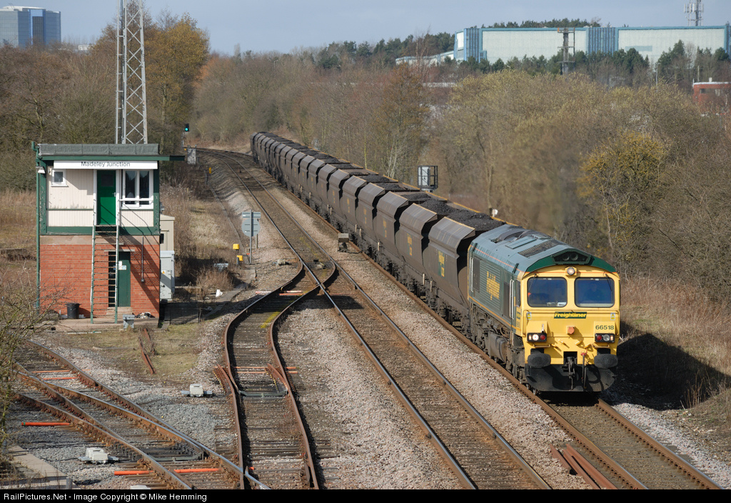 Class 66 518 runs past Madeley Junction with loaded coal hoppers for Rugeley Power Station