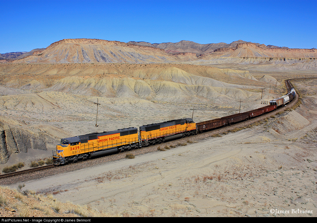 Union Pacific's Friday morning 'Potash Turn' curves west along the Book Cliffs at Vista curve, a couple of miles east of the siding at Thompson, Utah. The 12 car local was called out of East Yard at Grand Junction, Colorado at 09:30 a.m. that morning. Activity along the 85 mile journey westward to Brendel included meeting Amtrak #6 at Durham, an overtake by a BNSF Denver-Provo manifest at Fruita, and a one car set out at the lonely desert outpost of Westwater, Utah.