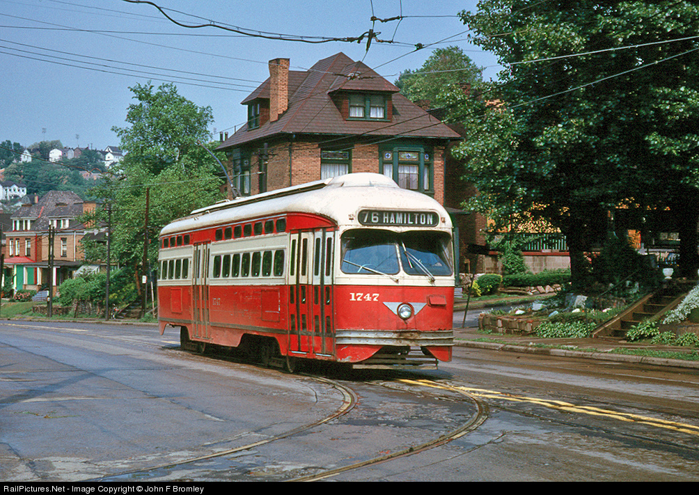At Swissvale Av and Jane St at the east end of Wilkinsburg PA, cars from downtown via Forbes (Route 64), Fifth Av (Route 76) and Penn Av (Route 87) all passed or terminated, as this 76 is about to do. Cars on the route usually were signed 76 HAMILTON-JANE ST, but not always, it seems.