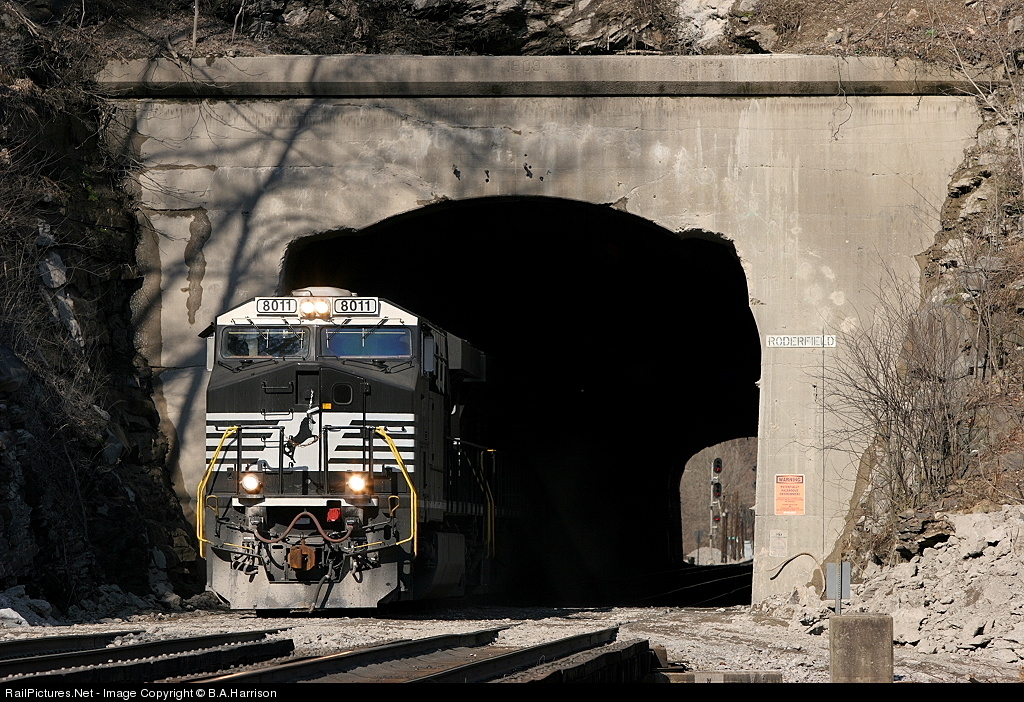 | With dust from tunnel work flying, two new AC motors making a pusher set head west for either a coal or grain drag. Much of the Heartland Corridor project is completed, evident from Roderfield tunnel which has been notched on the corners or shoulders and the ceiling raised for double stacks. Visible thru the tunnel are the Roderfield signals, with Vaughan tunnel being yards away. |