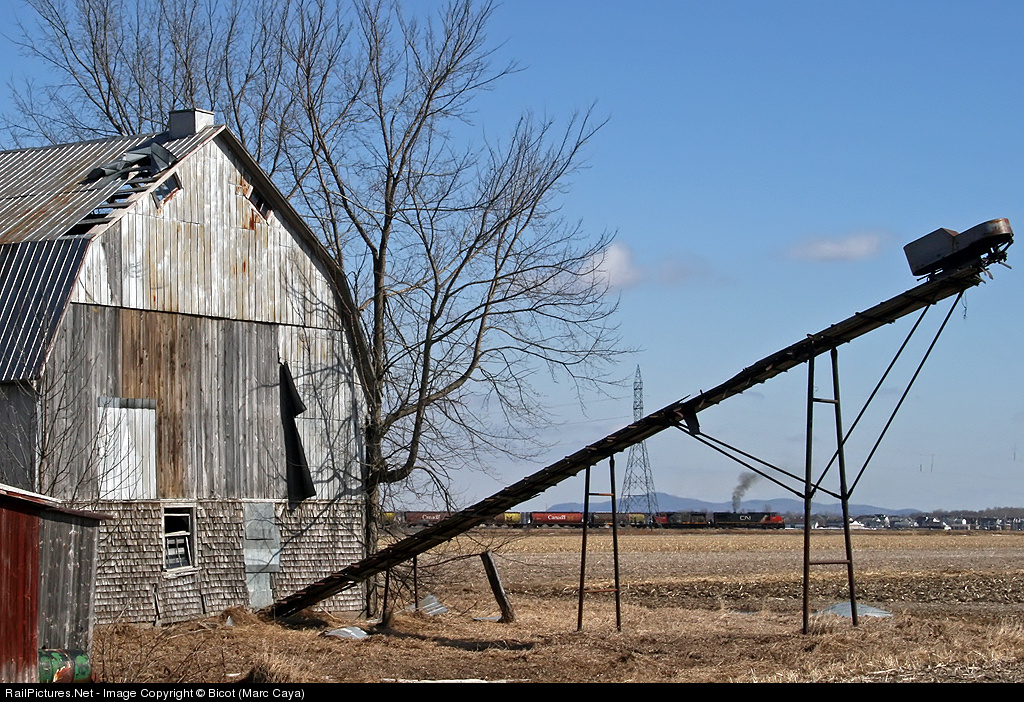 Smoky GE framed by an old cow poop conveyer; which one has the most value? And to make matters worst, the trailing unit is a very tired GP40-2w (CN 9525) running very clean.