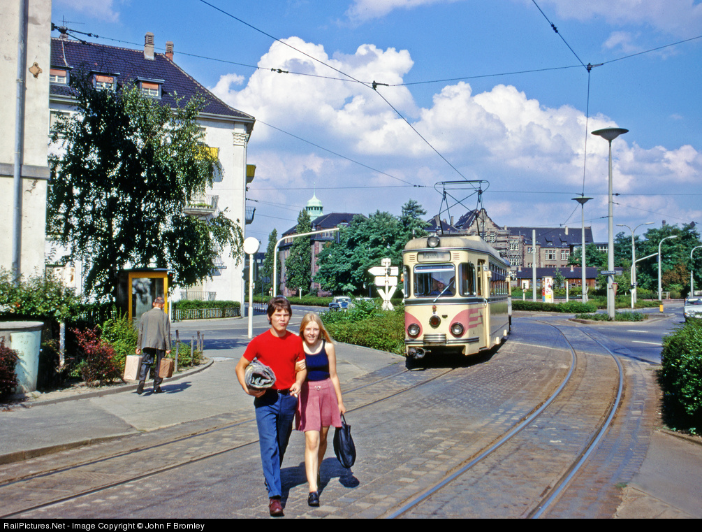 A 1950s-era train arrives at Mannheim from Heidelberg via Weinheim to a terminal later abandoned in favor of direct service to Mannheim Hauptbahnhof. It amused me that the fellow here thought I was taking a picture of his girlfriend and was ticked off, she thought I was taking a picture of her and considered it only her due. Both wrong.