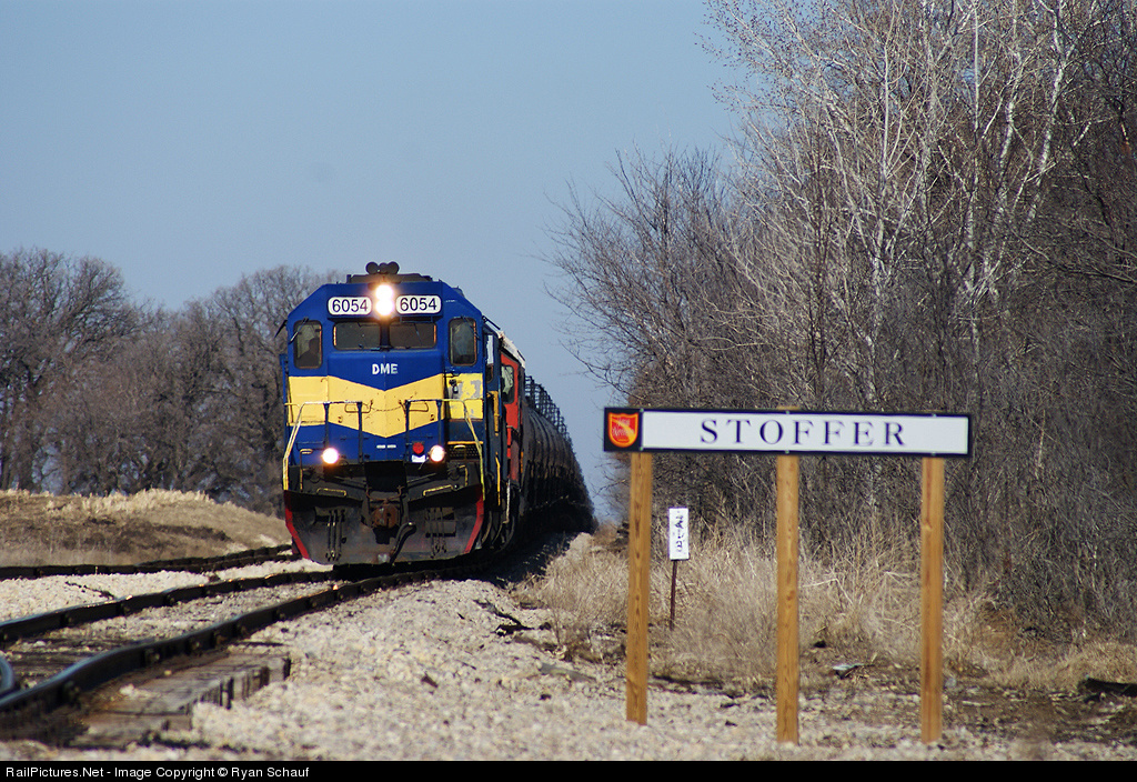 | After waiting for the Iowa Northern to clear Plymouth Jct., DME 6054 makes the short but slow journey across the IANR rails to Nora Jct. |