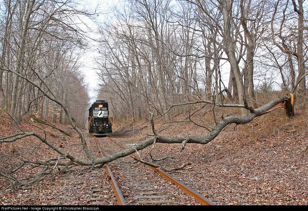 | "SA31 to the South Jersey dispatcher..." NS 5284 was delayed for a few hours on its journey from Browns Yard in Sayreville to Freehold by this fallen tree just west of MP 8 and the Schoolhouse Road crossing south of Jamesburg. It seemed like the crew couldn't reach anyone on the radio from this spot, forcing them to shove west to Jamesburg before alerting the dispatcher of their predicament. A hi-railer was eventually sent out to clear the tree and SA31 was able to continue on to Freehold. |