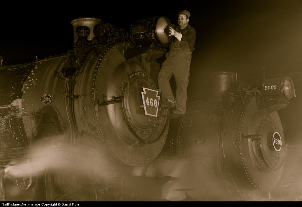 It was the little things that set the Pennsy apart from the competition, things like the headlight being polished before departure. Here PRR 460 sits along side H-10 class 7688 as they await their next call to service. Before too long both these engines will be off the roster, replaced by the diesel. Thanks to Pete Lerro and crew for lighting this scene.