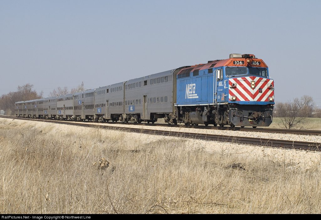 | Metra 106, the "City of Lockport" pulls the first ever Saturday outbound train as it approaches the Laraway Road Metra Station. This is the first day of Saturday service on Metra's Southwest Service district. |