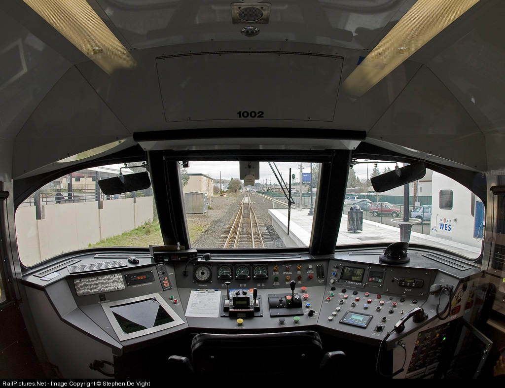 | Looking into the front cab of TriMet's new WES DMUs. Off to the right is a southbound WES train about to depart. Behind our train you can see the gauntlet track that allows the WES trains to get close enough to the platform for level boarding while allowing the freight trains that also use this line to slip by the station. |