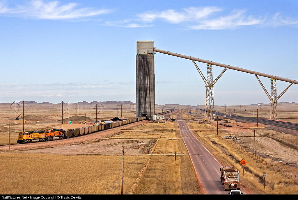 | The new Black Thunder West coal loadout facility is now operational. The coal runs from the Black Thunder mine along the tracks and then up and over the mainline just North of Reno Jct. You can see a train being loaded on the left, traffic on Hilight Rd., and a train on the mainline on the right. You can also spot other trains on the mine's loop track in the back left side of the photo. |