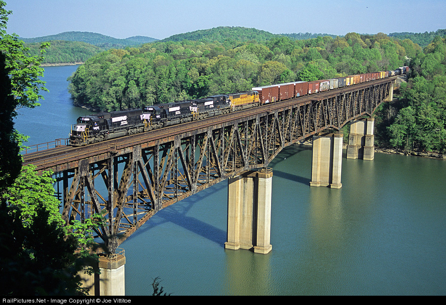Northbound NS 124 crosses over Lake Cumberland at Burnside with a SD60 leader on a beautiful spring day.