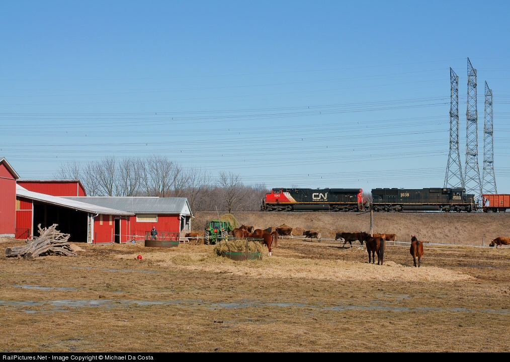 The thundering sound of a teamed up ES44DC and SD70I, drag all 10,148ft of train 371 up hill on the York Sub at an astonishing 22 MPH, the horses in the foreground don't seem to care much about the train and go on with their usual routine.