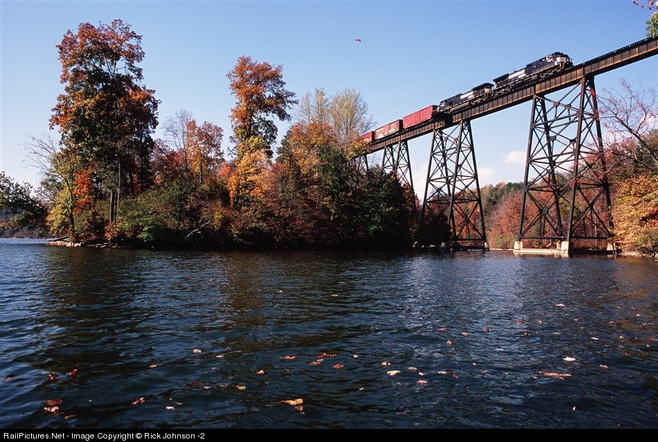| Eastbound 129 rolls across the picture perfect, 870 Ft, Falling Creek Trestle on Smith Mountain Lake one beautiful fall morning. Fujicolor 100 |
