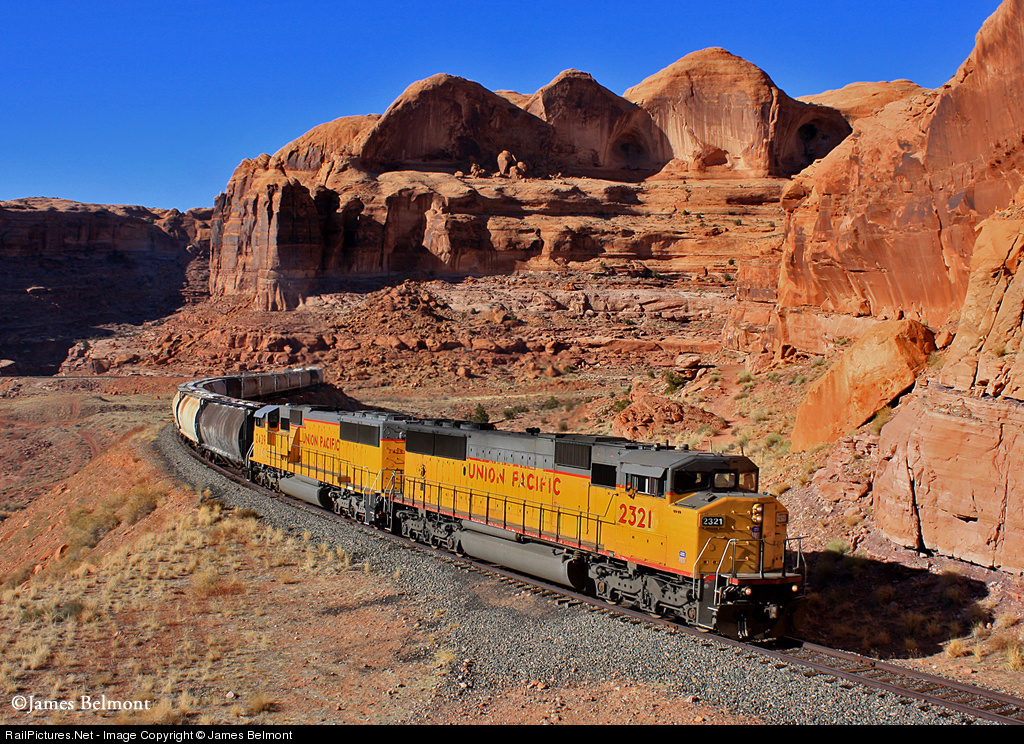 | A pair of SD60M's drag Union Pacific's 'Potash Turn' up a 1.2 percent grade and through a pair of five degree curves at the southern entrance to Bootlegger Canyon. Today's outbound train has 20 loads for East Yard at Grand Junction, Colorado. The roar the two EMD motors sounded terrific echoing from the sandstone cliffs that line the Colorado River. A public trail that leads to Corona and Bow Tie arches can be seen along the ridge above the cab of UP 2321. |