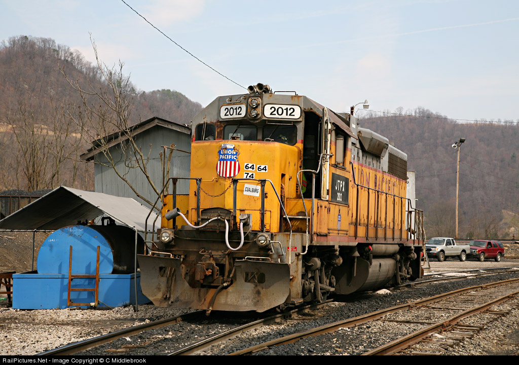| Former Union Pacific locomotive #2012 is now owned by Joseph Transportation and is being re-fueled at a coal yard in Marmet. This former UP engine is now resigned to moving coal cars around the processing yard. |