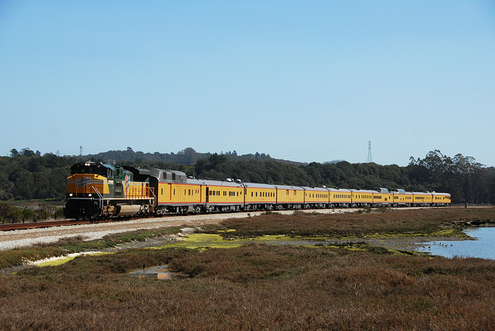 A group of UP's business cars passing thru Elkhorn Slough on the way to Oakland